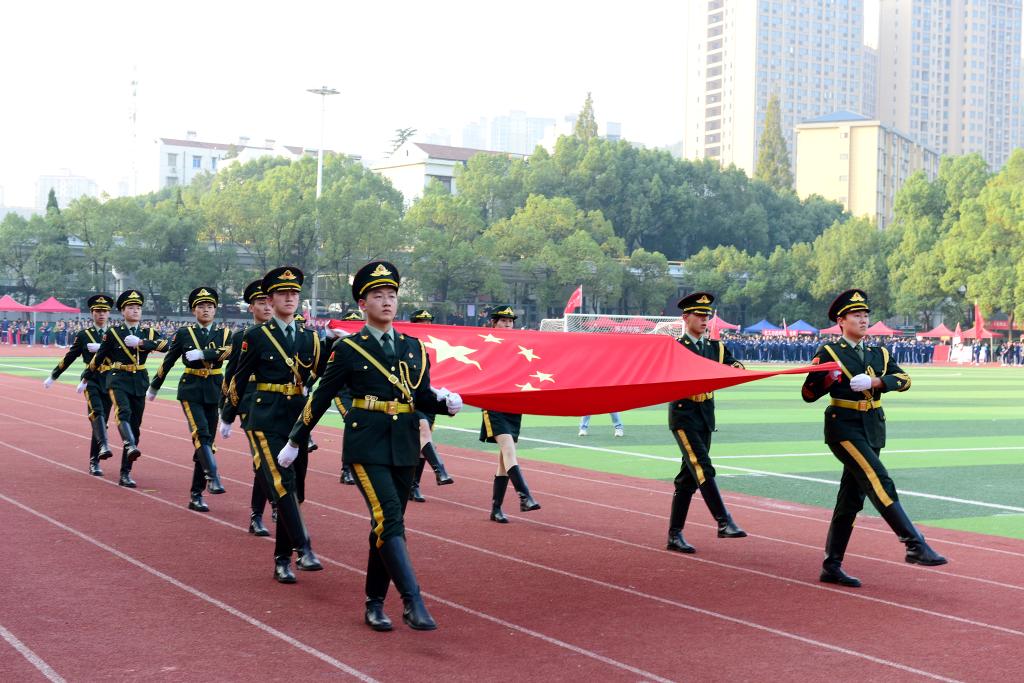 伴随着激昂的《义勇军进行曲》,国旗护卫队迈着铿锵有力的步伐,护卫着鲜艳的五星红旗,走在队伍的最前列,尽显飒爽英姿。彩旗方阵、鲜花方阵与裁判员方阵紧随其后,意气风发,气宇轩昂,飘扬的彩旗,红的如火,蓝的如海,五颜六色,让整个运动场气氛热烈非凡。18个运动员方阵精神抖擞,迈着矫健的步伐,喊着响亮的口号依次通过主席台。