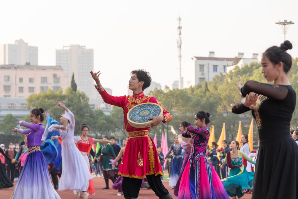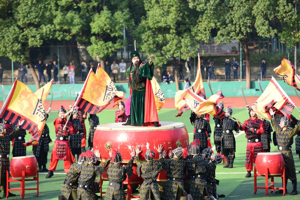 开幕式表演精彩纷呈。艺术学院将舞台“搬”到了运动场上,民族舞蹈舞姿刚劲跌宕,活泼潇洒,他们热情万分,默契十足,用青春展示了民族舞蹈独特的魅力;集体舞《关公屯兵》,旌旗猎猎,战鼓铮铮,关公雄风,惊艳全场,彰显了赤子的爱校之心、充满战斗的勇气、锐意勃发的势气。紧接着,来自8个学院1600名同学组成的方阵带来精彩的广播体操表演,动作整齐划一,尽显青春活力。