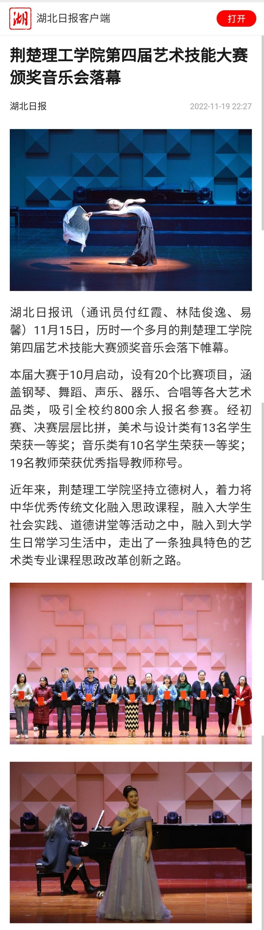 11月19日,湖北日报以“伟德国际victor1946第四届艺术技能大赛颁奖音乐会落幕”为题,对伟德国际第四届艺术技能大赛情况进行了报道。原文转载如下: