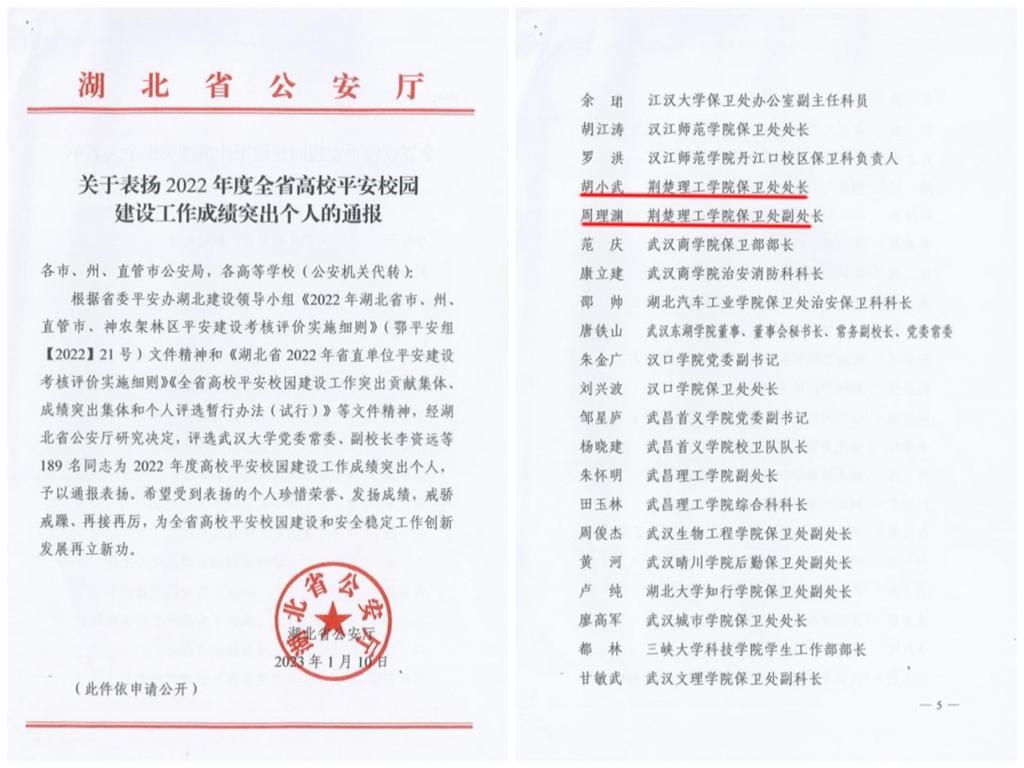 近日,湖北省公安厅印发《关于表扬2022年度全省高校平安校园建设工作成绩突出个人的通报》,伟德国际保卫处处长胡小武、副处长周理渊受通报表彰。