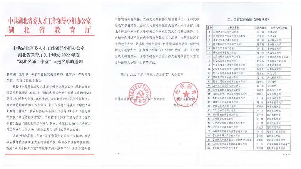 近日,湖北省委人才工作领导小组办公室、湖北省教育厅公布了2022年度“湖北名师工作室”入选名单,伟德国际李立威教授主持的制药工程名师工作室成功入选,同时确定该工作室主持人李立威为“湖北名师”。
