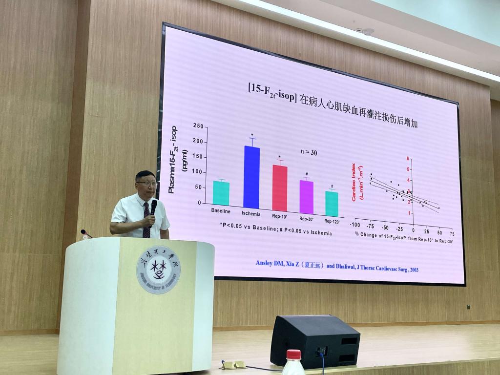 夏正远教授以《铁死亡及其对糖尿病心肌缺血再灌注损伤的影响》为题,从心血管疾病的流行病学特征带入课题,由研究假设和背景逐渐引出15-F2t-isoprostane与心肌缺血-再灌注损伤机制的作用关联,结合自己多年来的研究成果和自1972年以来全球科学家对细胞死亡的研究历程,提出了铁死亡在人体器官、组织损伤发生发展中发挥的重要作用。深入浅出的阐述了铁死亡的特征与本质,揭示了铁死亡的多种调控因素,详细介绍了铁死亡的研究方法和现阶段成果,激发了大家对铁死亡的研究兴趣,为从事相关研究领域的老师提供了研究切入点。讲座尾声,夏正远教授交流了高影响因子论文发表过程中的注意事项,分享了研究团队合作精神。