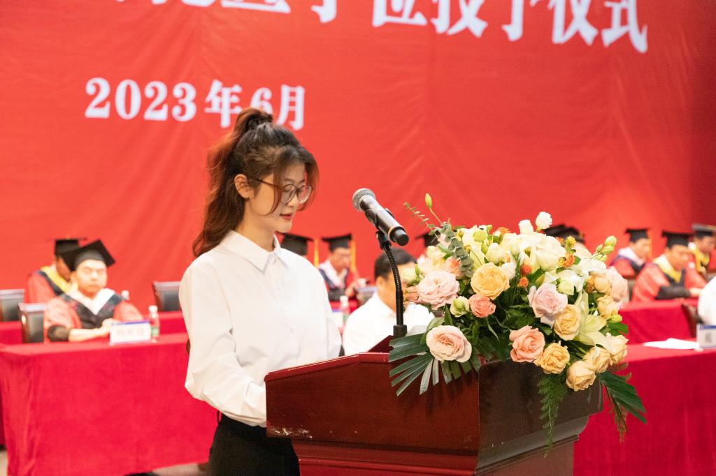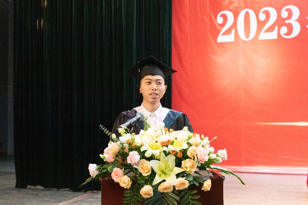 在校生代表、化工与药学院王颖漪,校友代表、电子信息工程学院余为伟,2022届毕业生代表、艺术学院宋若晨发言,通过分享成长过程中的感悟,表达了对母校的感激之情和对2023届毕业生的美好祝愿。