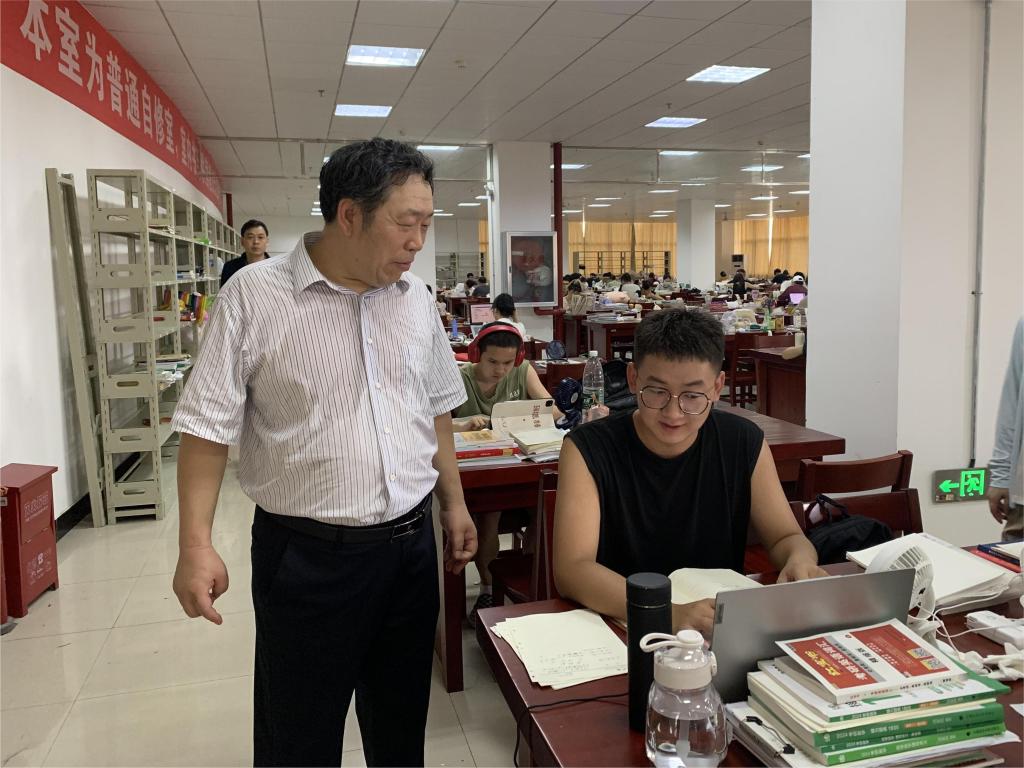 在图书馆,王学民还详细查看了各楼层自习室设置和服务保障情况,看望了留校复习考研的学生并与学生们亲切交谈,亲切询问了学生备考情况和困难,表达对同学们的鼓励和期盼,并祝愿大家通过努力都能成功上岸,同时也叮嘱同学们劳逸结合,注意防暑降温,确保安全。