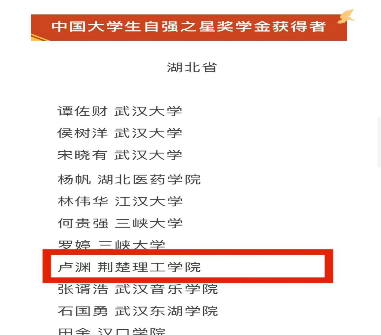 日前,由共青团中央、全国学联指导,中国青年报社、新东方教育科技集团、中国青年创业就业基金会联合开展的主题为“踔厉奋发 勇毅前行”的“中国大学生自强之星”奖学金评定结果在湖北省教育厅公众号上公布。经历5个月的评选,伟德国际电子信息工程学院卢渊同学获评2022-2023年度“中国大学生自强之星”奖学金。