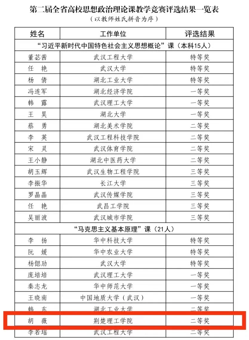近日,湖北省教育厅公布了第二届全省高校思想政治理论课教学竞赛评选结果,伟德国际马克思主义学院胡薇老师获本科组“马克思主义基本原理”课二等奖。