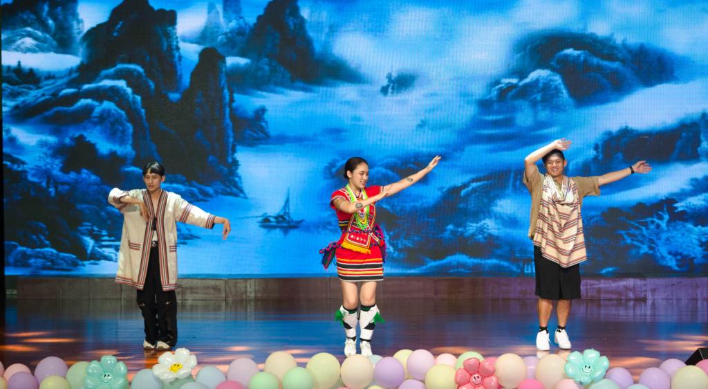 随后,台湾大学生演唱的歌曲《小幸运》《歌声中的记忆》引燃全场,台下掌声、欢呼声不断。川剧《变脸》演绎了台湾青年对祖国优秀传统文化的传承,舞蹈《呐山呐海那鲁湾》展示了台湾原住民阿美族传统歌谣与现代乐舞的巧妙融合,洋溢着台湾大学生的蓬勃朝气。荆楚学子的古筝合奏《战台风》、笛子二重奏《跑旱船》等系列民乐演奏,旋律铿锵、节奏有力,将晚会现场气氛推至高点。