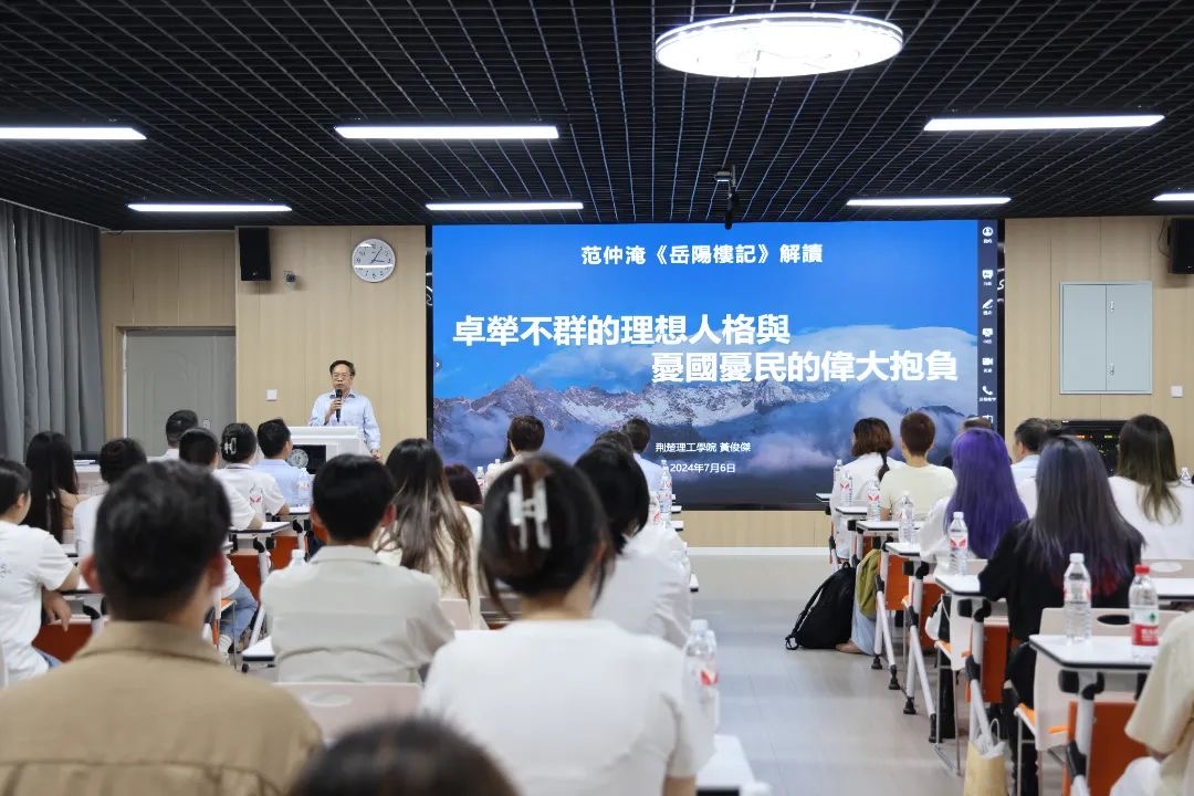 活动前,荆台大学生共同沉浸于一堂意蕴深远的中华文化课之中,聆听了伟德国际黄俊杰教授主讲的《卓荦不群的理想人格与忧国忧民的伟大抱负》——范仲淹《岳阳楼记》解读。“不以物喜,不以己悲”的积极乐观人生态度,“先天下之忧而忧,后天下之乐而乐”的伟大抱负和爱国主义情怀,激起了两岸青年学子的强烈共鸣,课堂上大家交流感想踊跃发言,表现出了对中华优秀传统文化的喜爱。