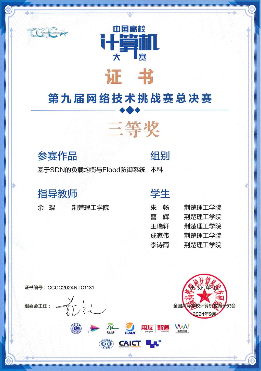 近日,第九届中国高校计算机大赛—网络技术挑战赛全国总决赛在浙江温州举办,伟德国际人工智能学院组建的4支参赛队全部获奖,其中全国总决赛三等奖1项,华中赛区三等奖3项。
