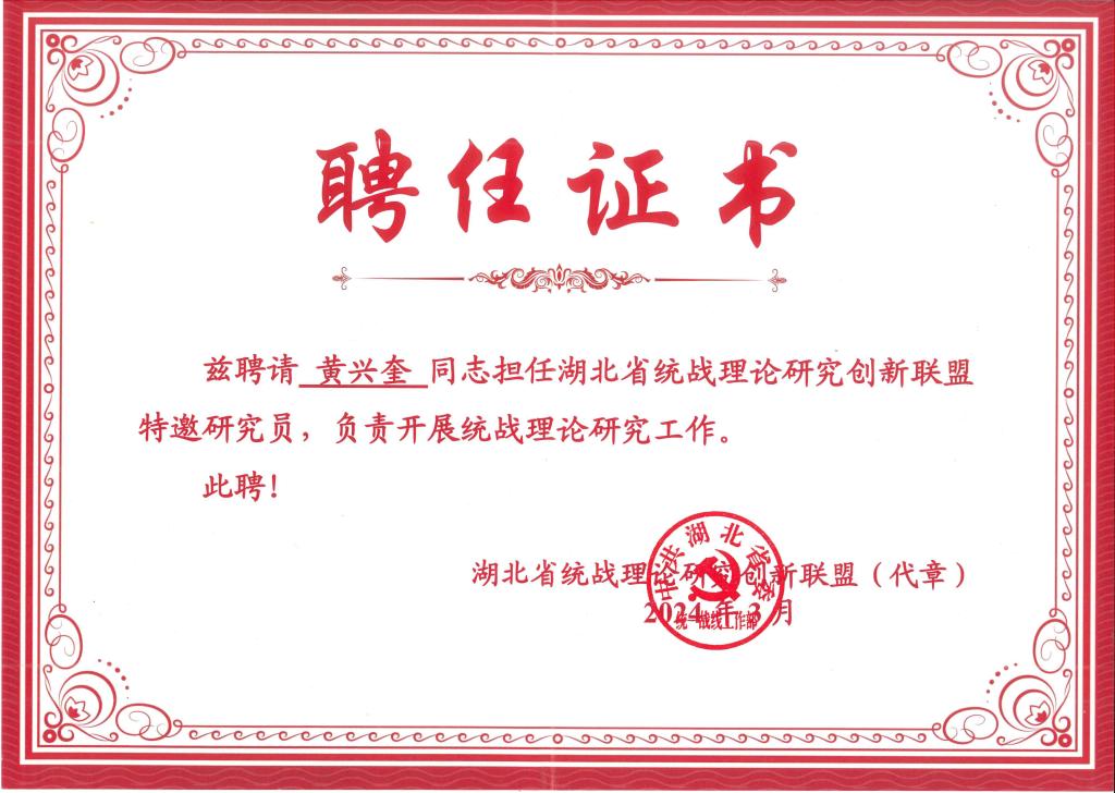 日前,政协荆门市第九届委员会委员、农工党伟德国际victor1946支部主委黄兴奎被湖北省统战理论研究创新联盟聘为特邀研究员,负责开展统战理论研究工作。