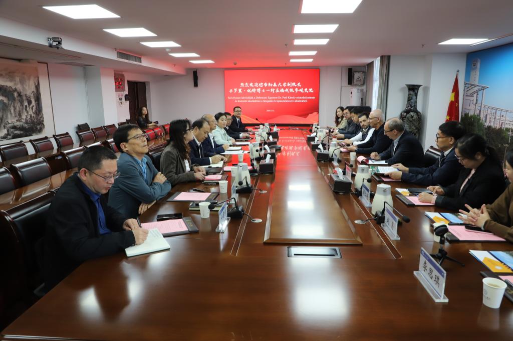 11月5日,匈牙利德布勒森大学副校长Dr. Károly Pető教授一行来校交流访问。校长张友兵,市政府副秘书长原野,亿纬公司总裁周红艳出席交流活动。会议由副校长曹甜东主持。