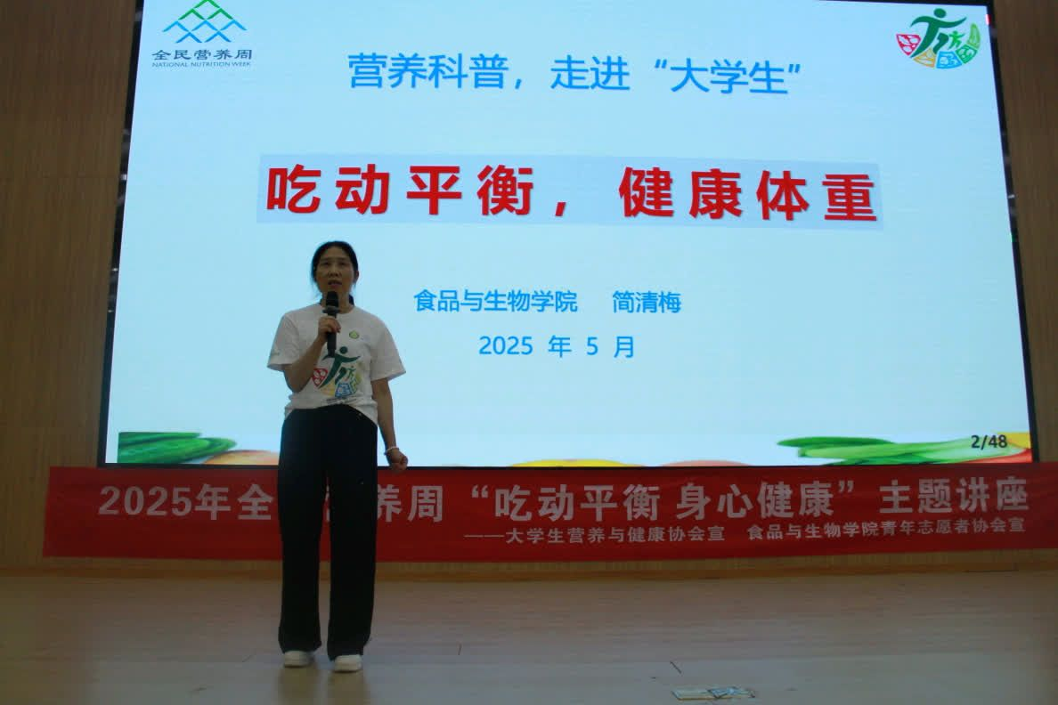 为深入贯彻落实《健康中国行动(2019-2030年)》、《国民营养计划(2017-2030年)》重要部署,积极响应“体重管理年”三年专项行动号召,5月17日至24日,食品与生物学院举办“全民营养周暨学生营养日”主题活动。本次活动由大学生营养与健康协会主办,以“吃动平衡、健康体重、全民行动”为活动主题,通过形式多样、内容丰富的系列活动,助力青年学子树立科学的“健康管理”理念,为青春校园注入健康活力。