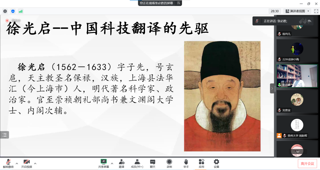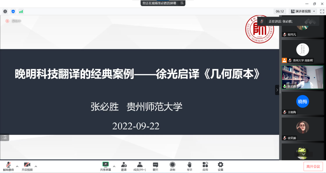 外院新闻网讯(闫祎琪 报道| 周彰辉 摄影) 2022年9月22日下午2:30至4:30,由贵阳中日交流之窗主办的学术讲座通过以腾讯会议线上形式进行。本次讲座邀请贵州师范大学教授、博士生导师张必胜教授主讲,题为:晚明科技翻译的经典案例——徐光启译《几何原本》。讲座由kaiyun开云官方副院长王晓梅教授主持,kaiyun开云官方130余名师生聆听了讲座。