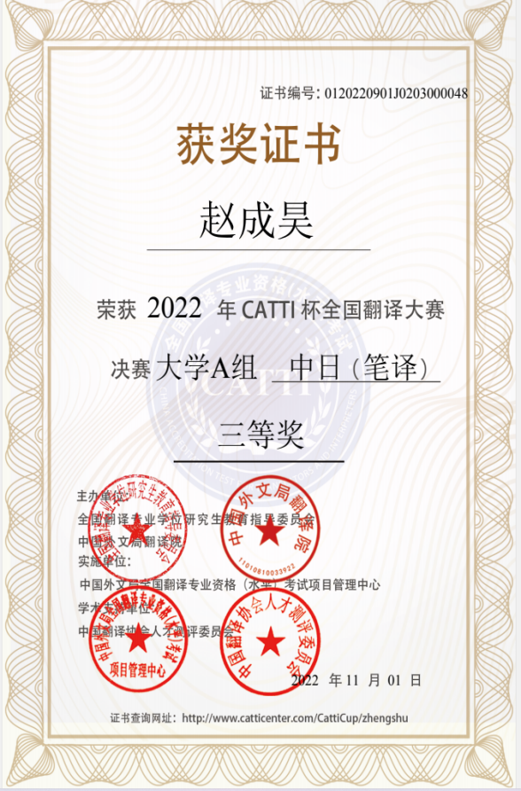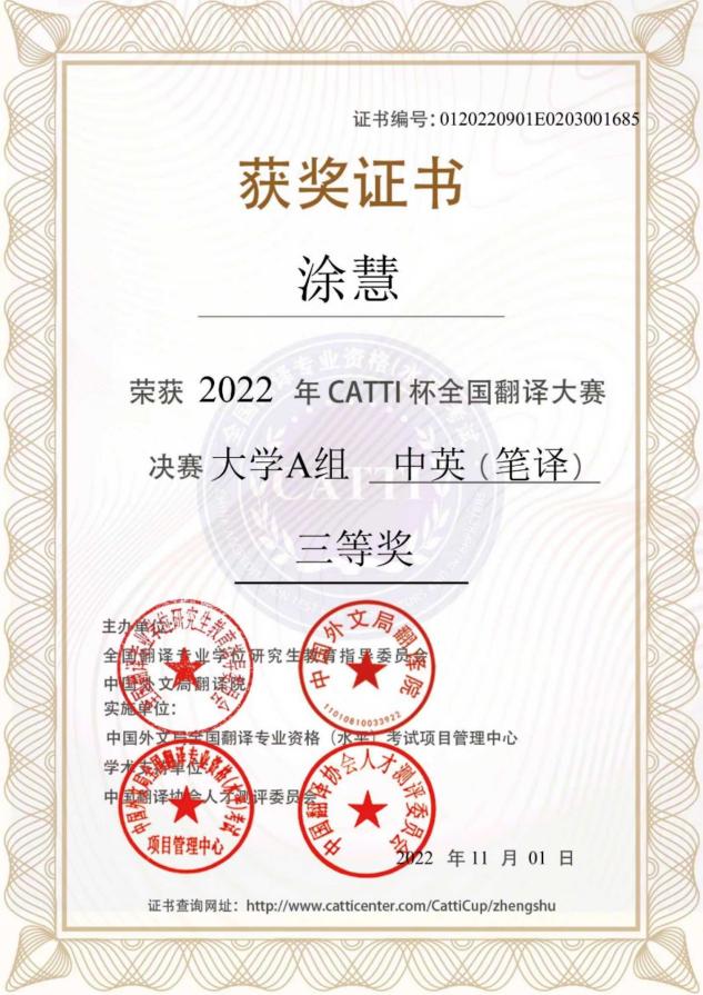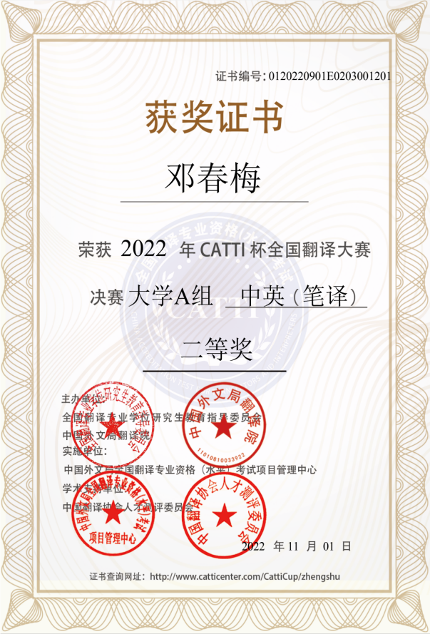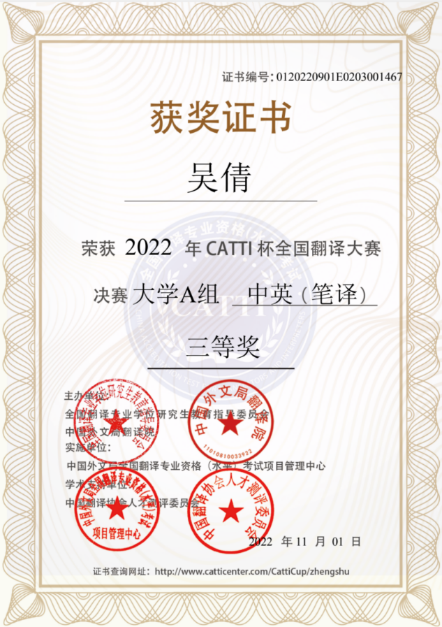 在10月底结束的2022年“CATTI杯”全国翻译大赛决赛中,kaiyun开云官方学生表现优异,喜获佳绩,共有四名学生荣获奖项。英语专业本科生邓春梅同学荣获大学A组中英(笔译)二等奖,涂慧和吴倩同学荣获中英(笔译)三等奖。日语翻译专业研究生赵成昊荣获大学A组中日(笔译)三等奖。kaiyun开云官方荣获优秀组织奖。